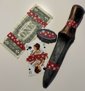 Es wird 4 verschiedene „Dinge of Doom“ geben, was alles Gegenstände sind, welche mit dem Anfangsbuchstaben D anfangen und welche einigermaßen IT-tauglich weitergegeben werden können, so dass die Immersion nicht allzu sehr gestört wird. Die Gegenstände werden mit rotem Klebeband gekennzeichnet sein, so dass Ihr wisst, dass dies kein wirklicher IT-Gegenstand ist (Dollarnote, Dolch, Dame, Döschen (inkl. Überraschung darin) ).